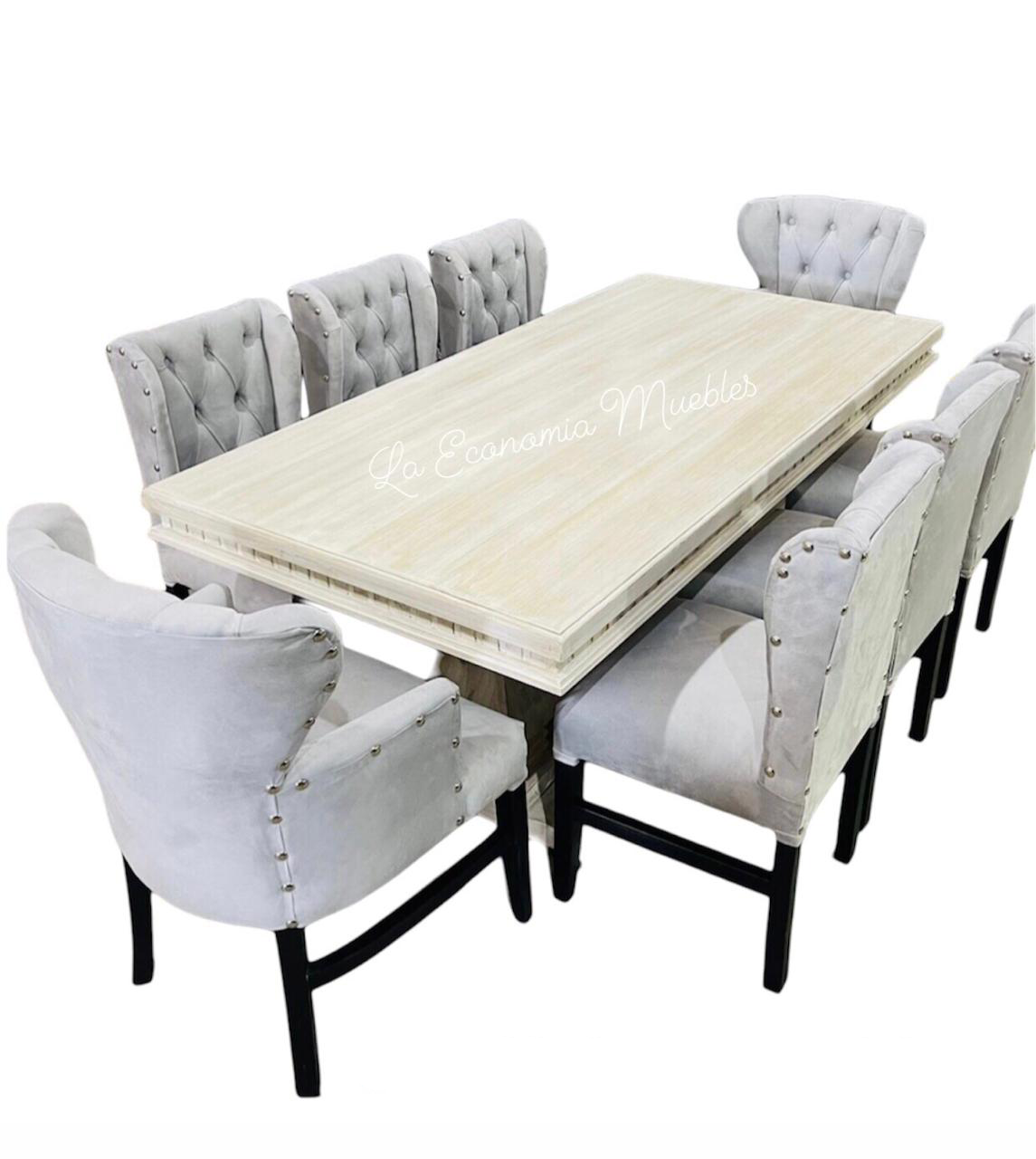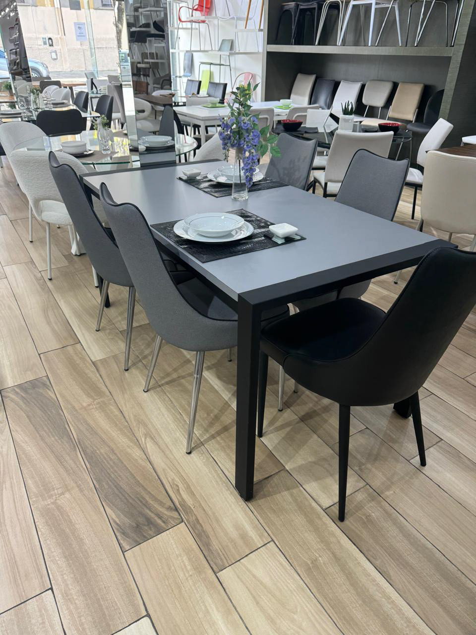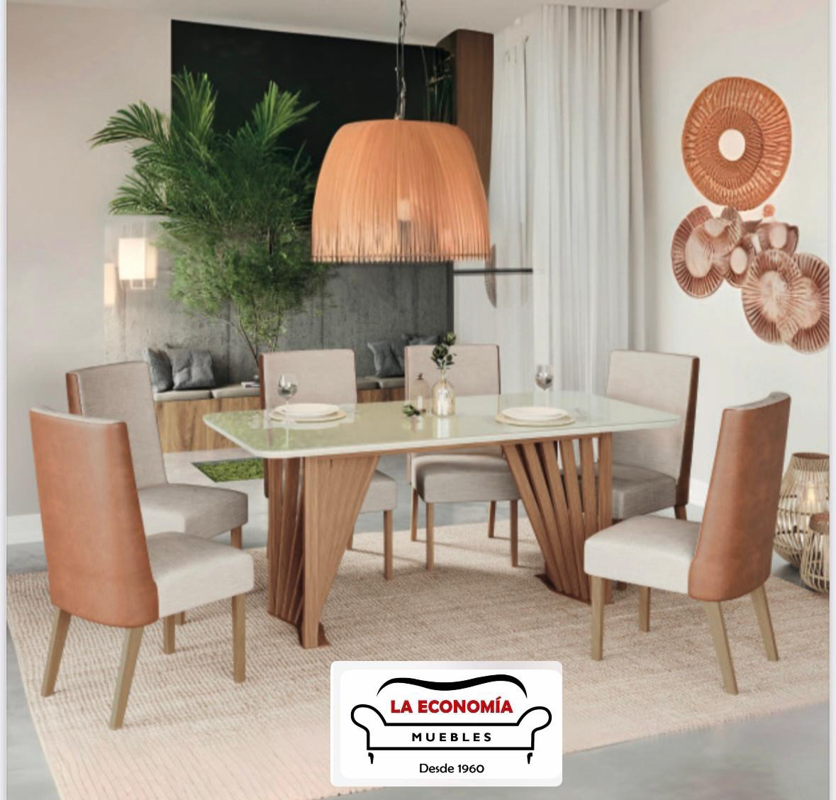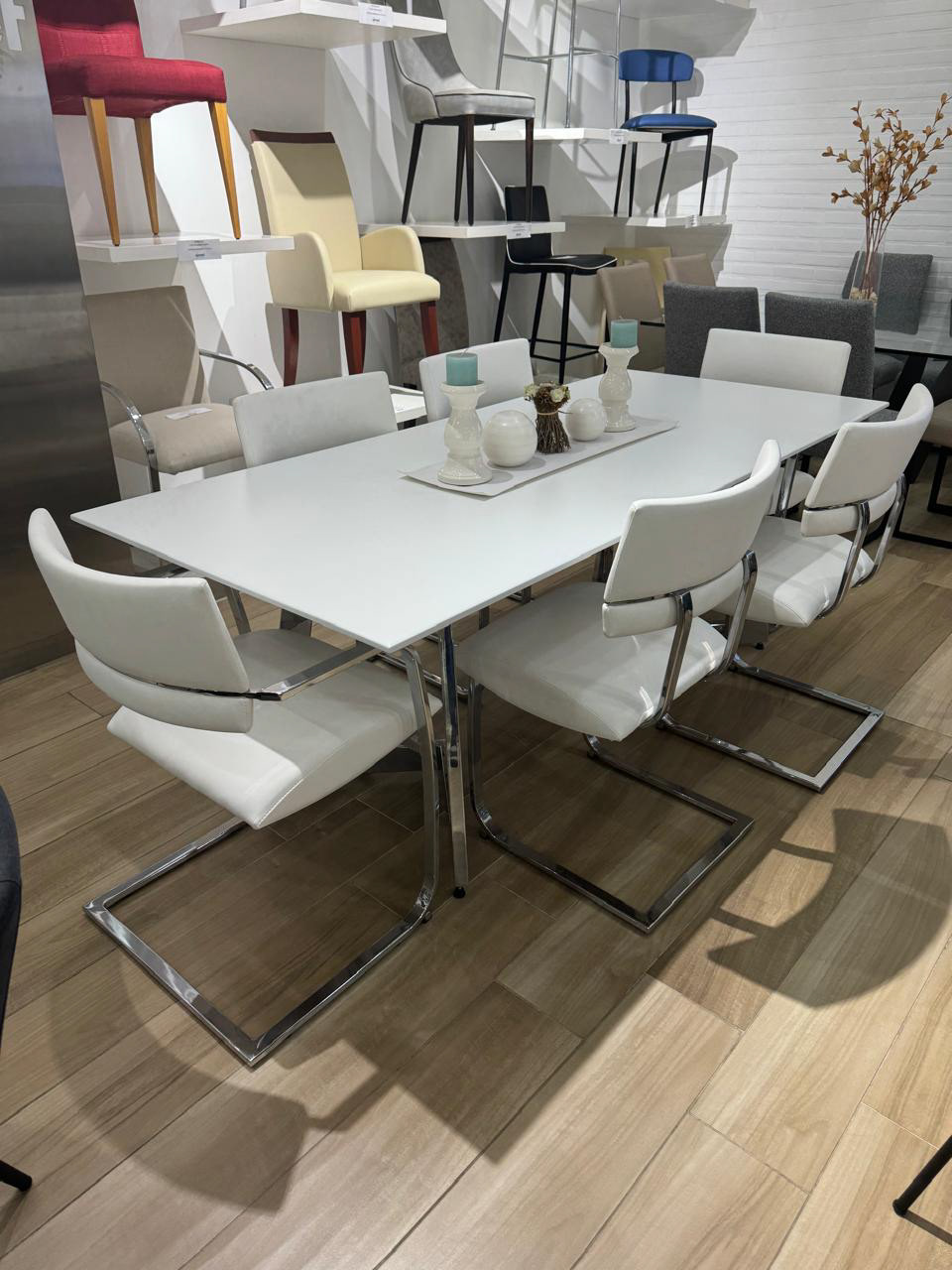 Mesa (1.60m x 0.80m) con 6 sillas vestidas en eco-cuero (opciones de color: blanco, crudo, negro, rojo).