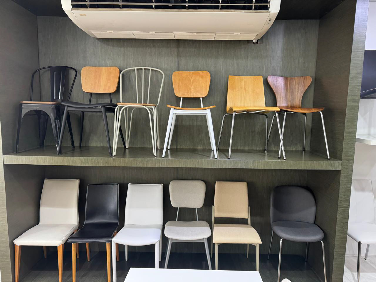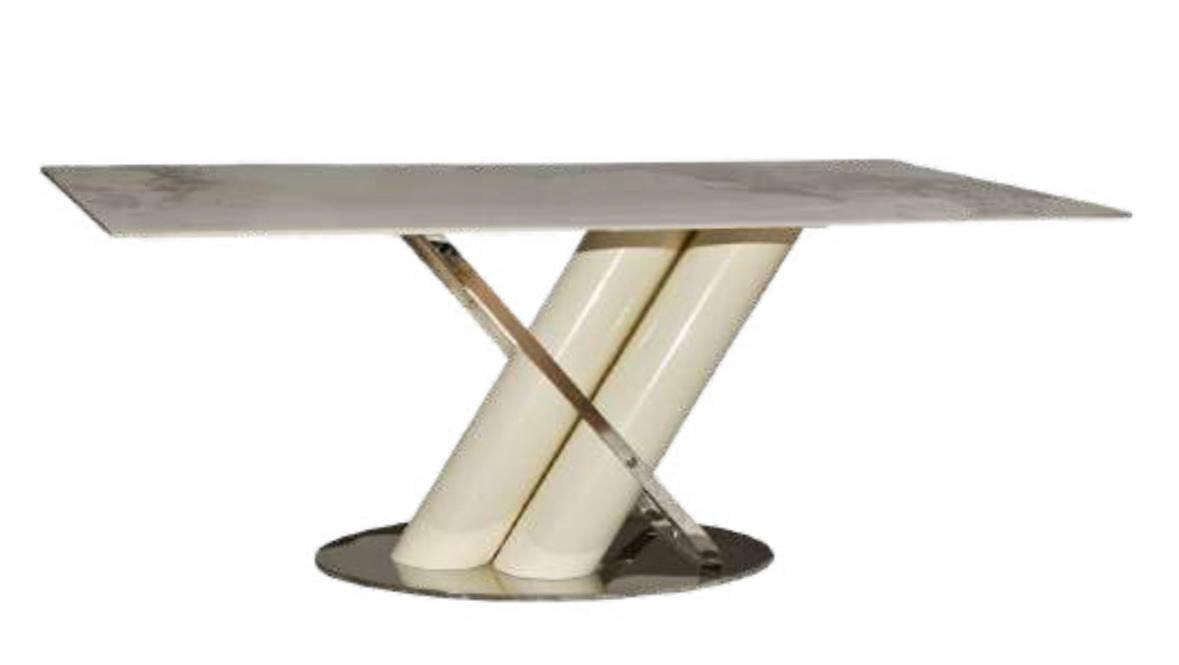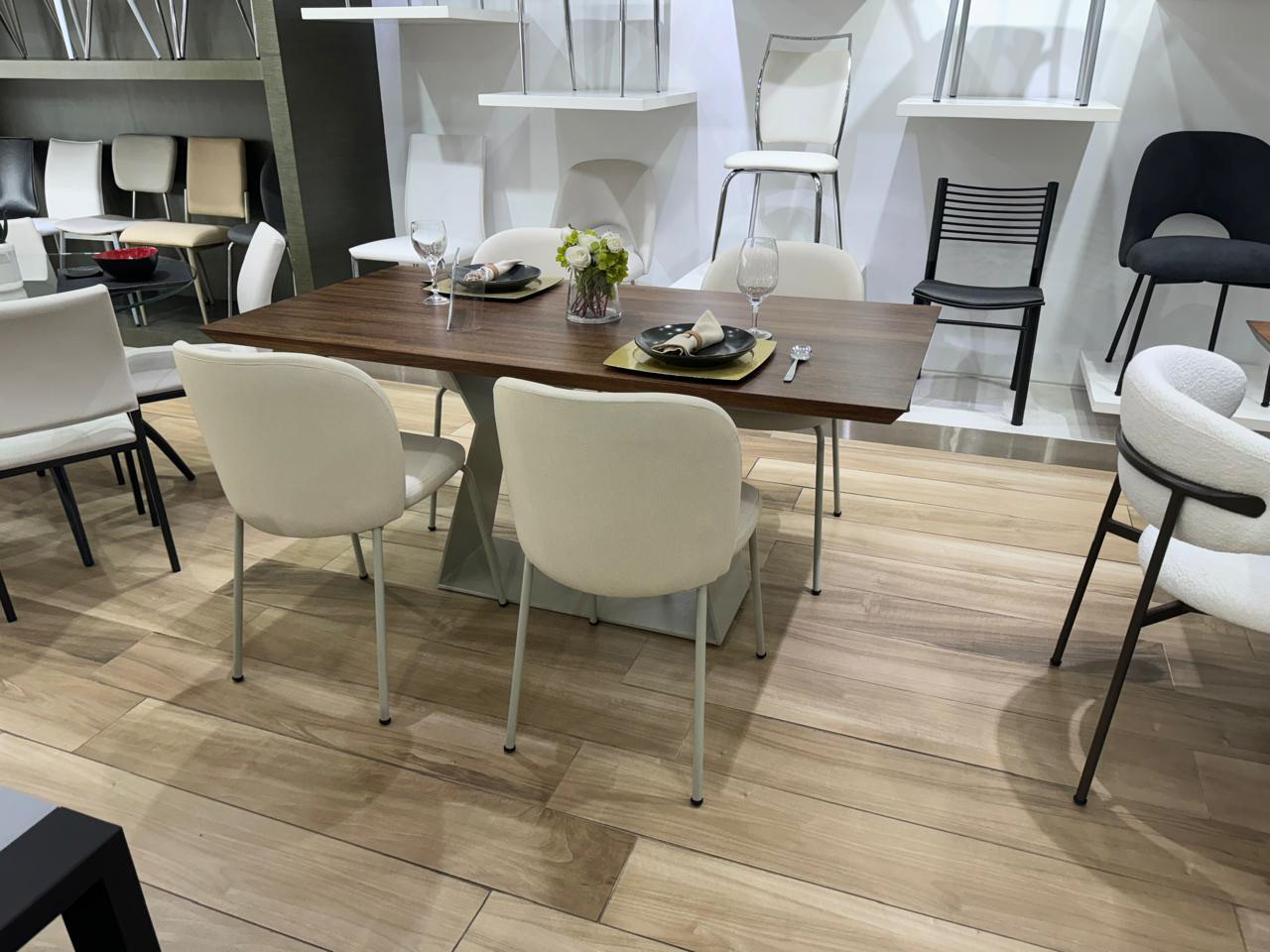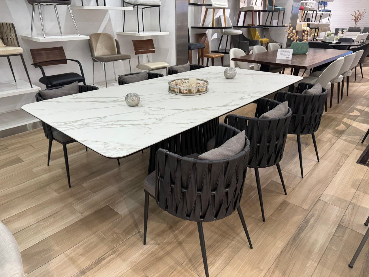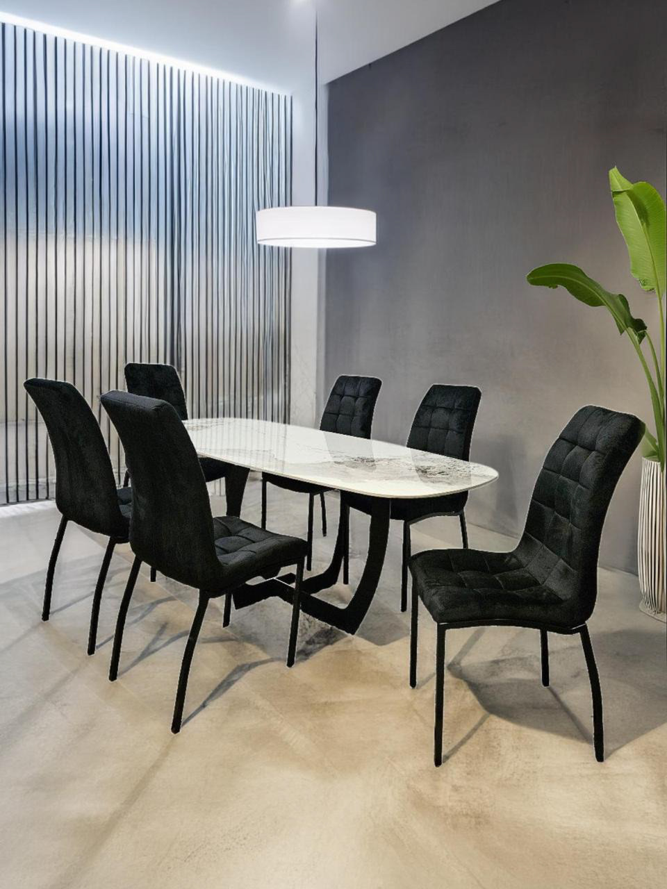 Mesa (1.60m x 0.80m) con 6 sillas vestidas en eco-cuero (opciones de color: blanco, crudo, negro, rojo).
