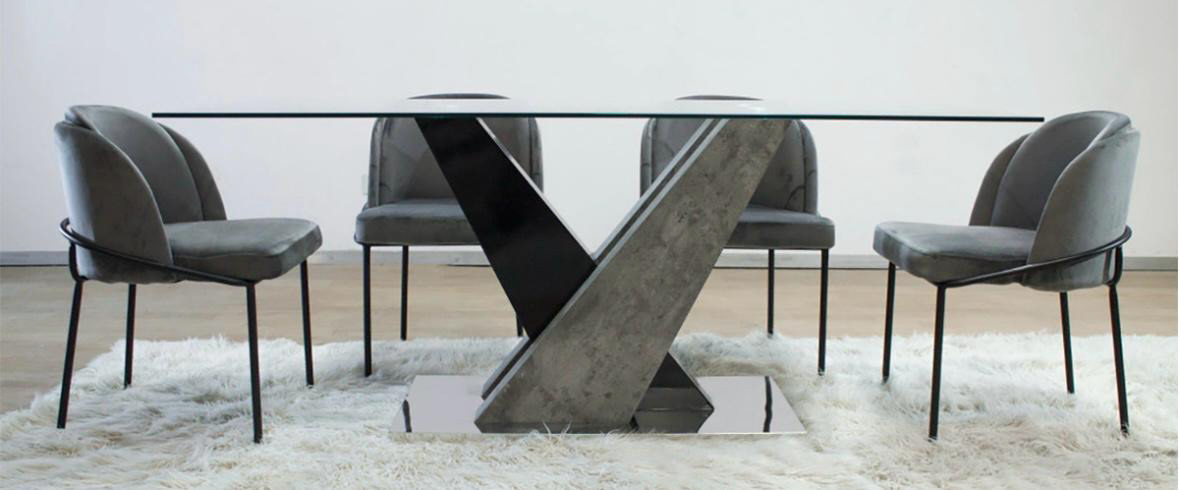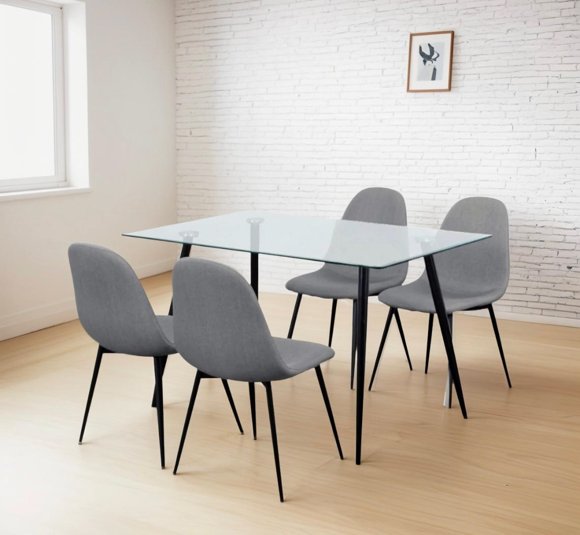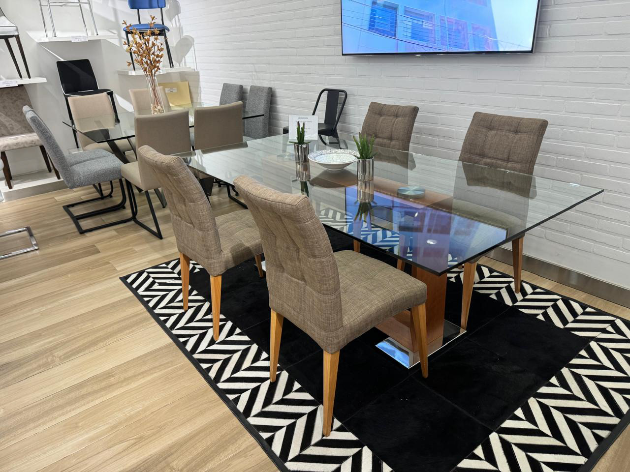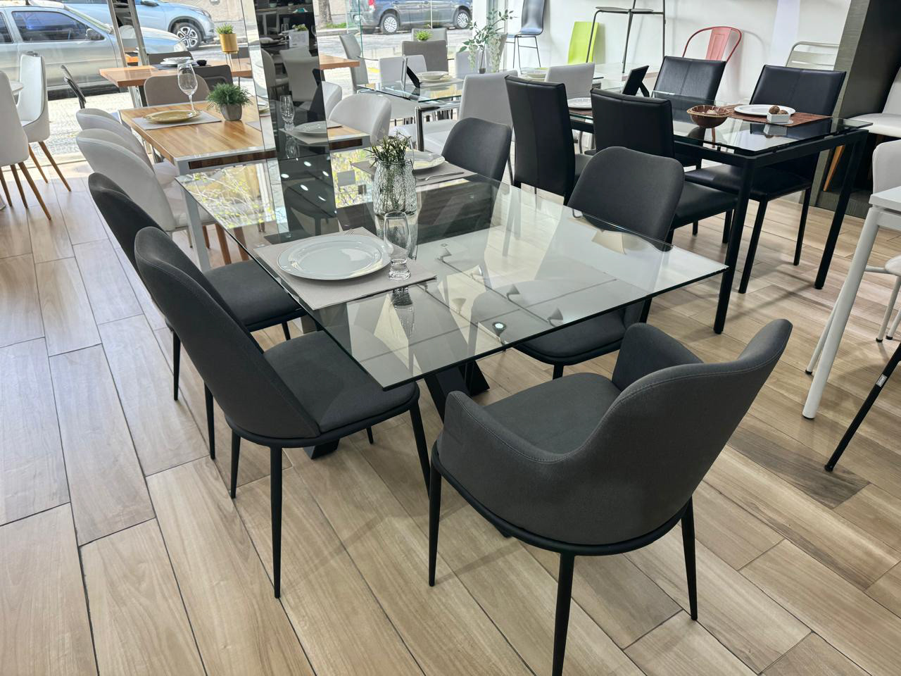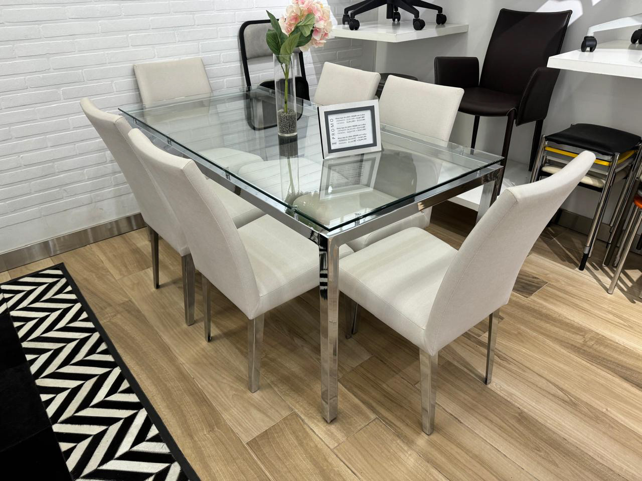 Mesa extensible (1.40m x 0.85m a 1.80 x 0.85m) con dos vidrios esmerilados y 6 sillas vestidas en eco-cuero o chenille. (colores a elección).