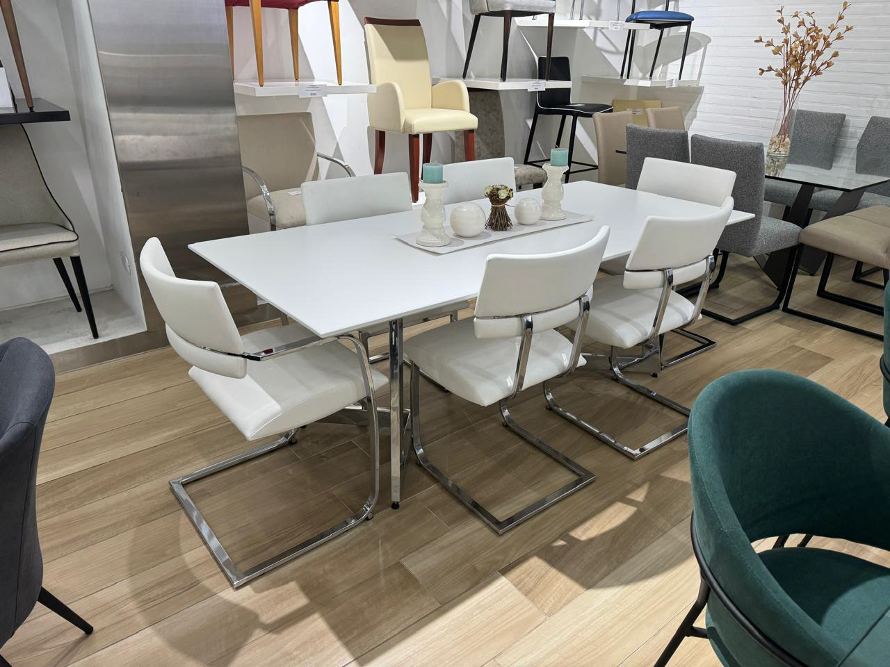 Mesa en paraíso (1.60 x 0.80m) con patas laqueadas blancas con 6 sillas de madera guatambú tapizadas en eco-cuero blanco.