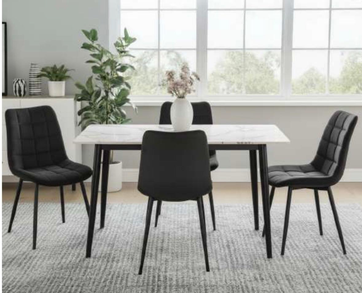 Mesa en paraíso (1.40m x 0.80m) con patas laqueadas blancas y 4 sillas en paraíso con tapizado en chenille. (colores a elección).