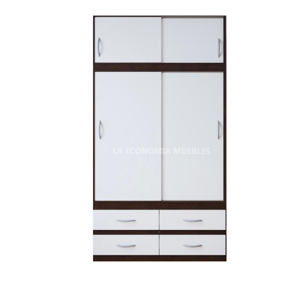 Placard de 1.20m x 2.20m, con dos puertas corredisas, estantes, espacio para colgar, cuatro cajones, alzada desmontable. Colores blanco, wengué, mogno, roble.